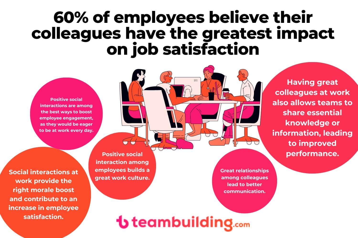 According to Statista’s 2019 Survey on Contributors to Employee Satisfaction in the U.S., 60% of employees believe their colleagues make the biggest contribution to job happiness.