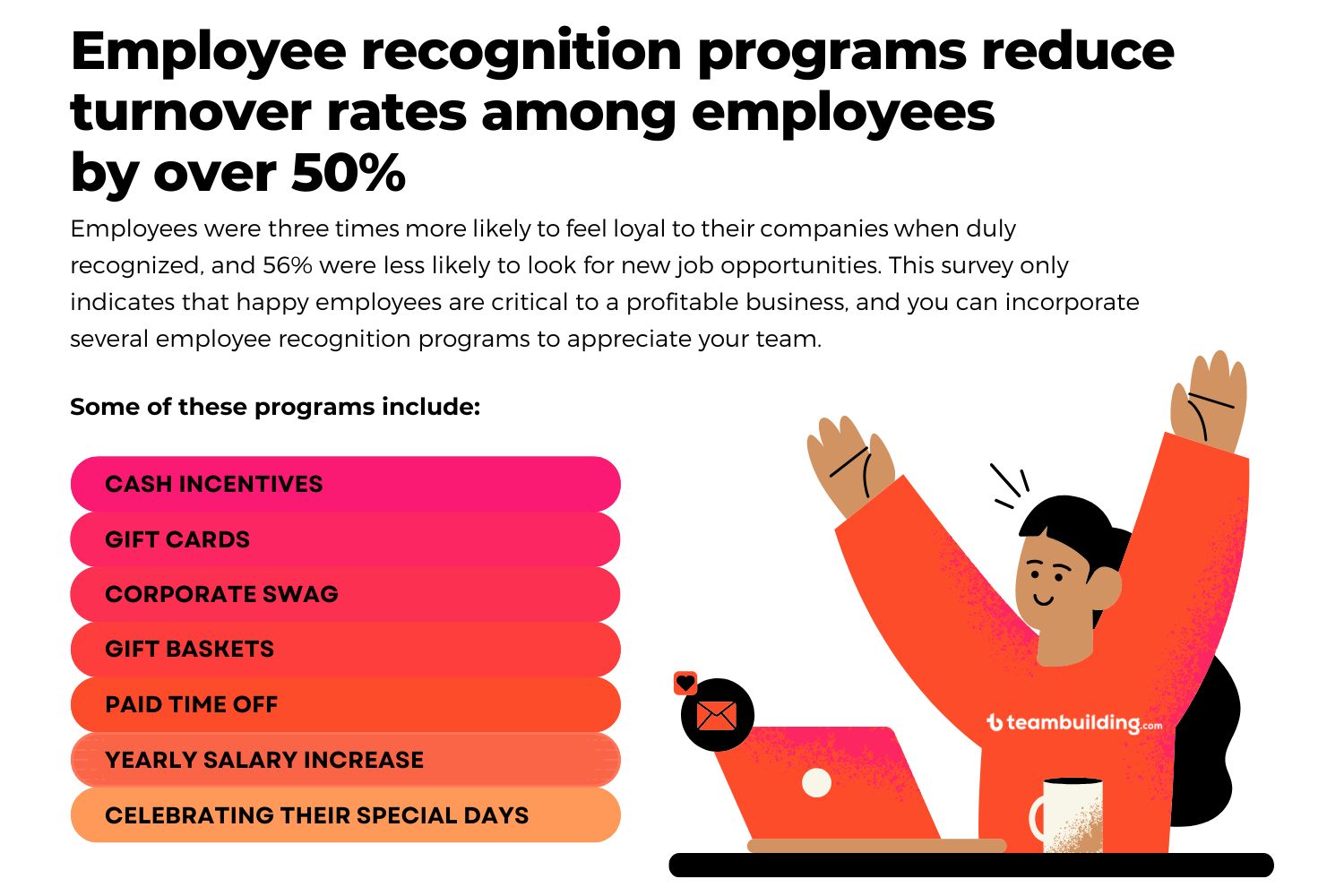 13. Employee recognition programs reduce turnover rates among employees by over 50%