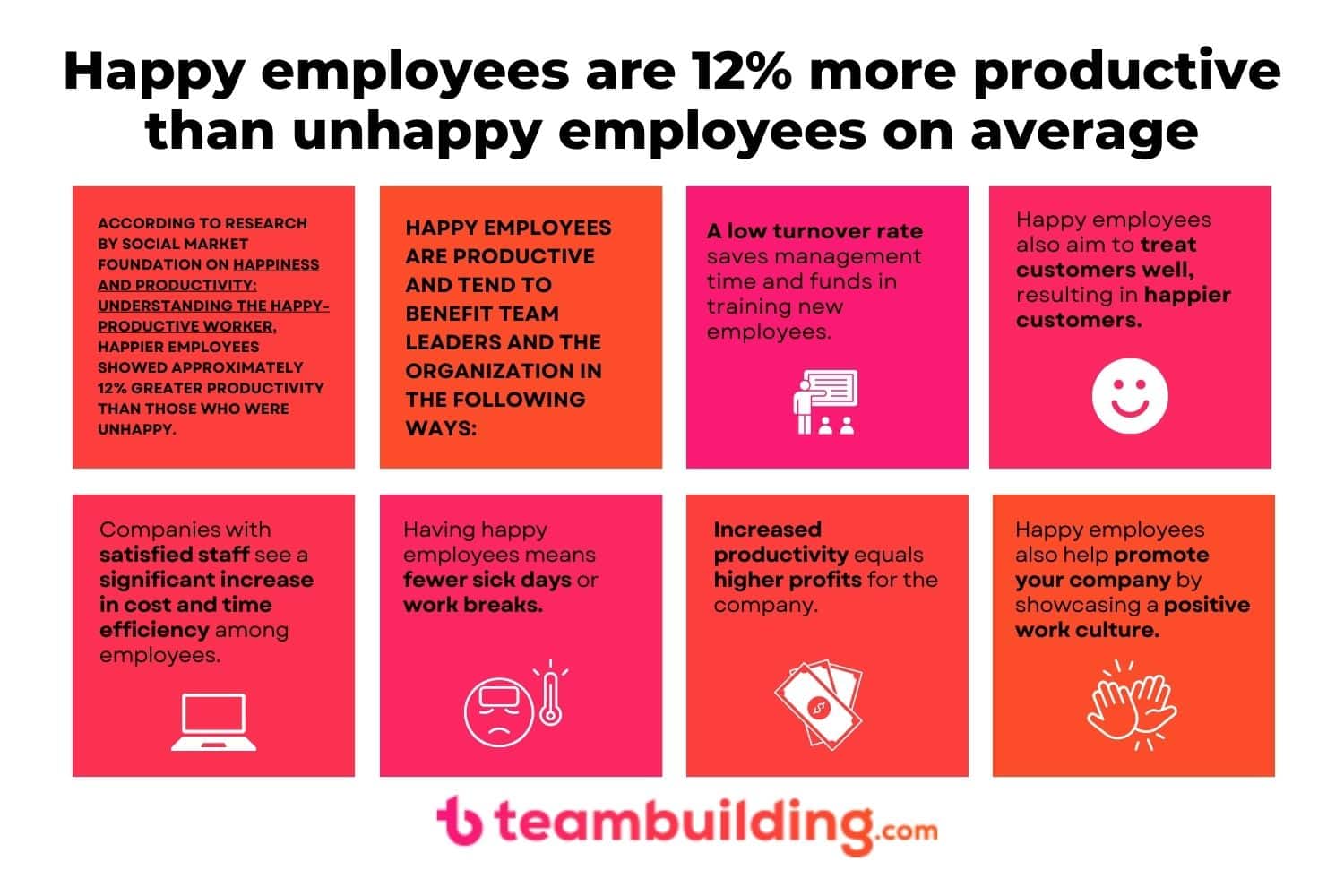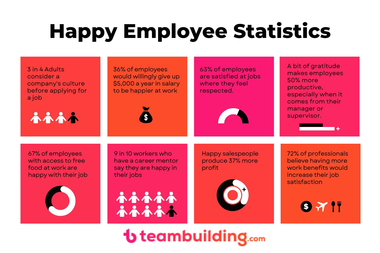 You can use this data in any content, including blog articles, social media, formal presentations, and internal communications. Please cite the source as teambuilding.com and link to https://teambuilding.com/blog/happy-employee-statistics.