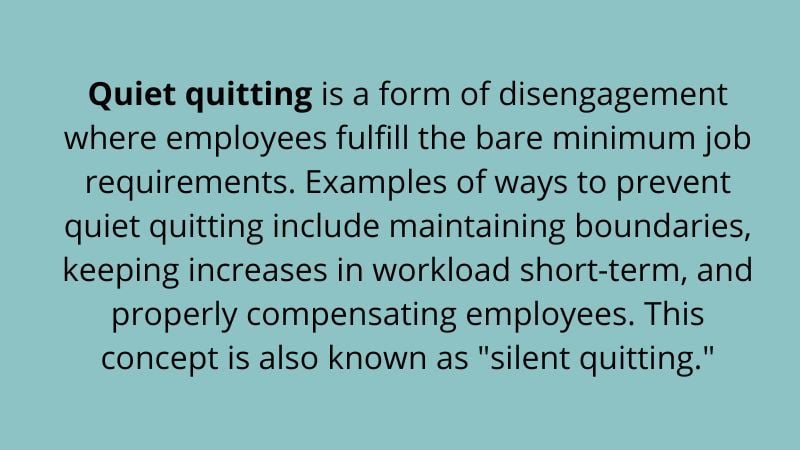 Quiet quitting is a form of employee disengagement where team members stop going above and beyond and fulfill the bare minimum job requirements to keep their jobs. Examples of ways to prevent quiet quitting include maintaining boundaries, keeping increases in workload short-term, and properly compensating employees. This advice helps employers understand the reasons behind the phenomenon and give actionable steps to fix the problem. This concept is also known as “silent quitting.”