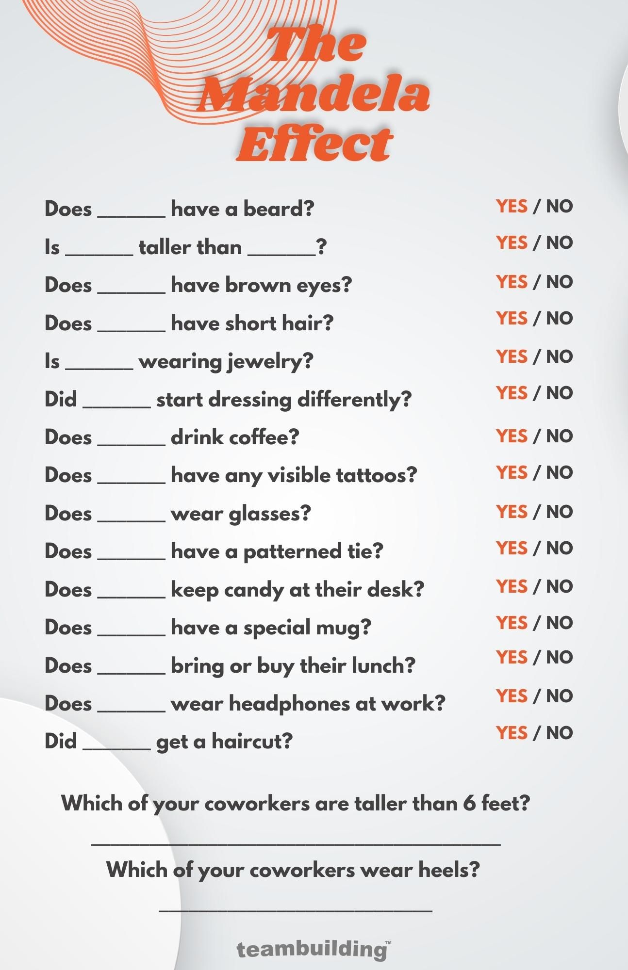 The Mandela Effect is a phenomenon where people remember an event or detail differently than real life, or have a hard time distinguishing whether or not a detail is real or imagined. This game draws inspiration from that sensation and tests teammates’ rusty memories. The exercise challenges team members to recall details about each other after being separated for a long period of time.
