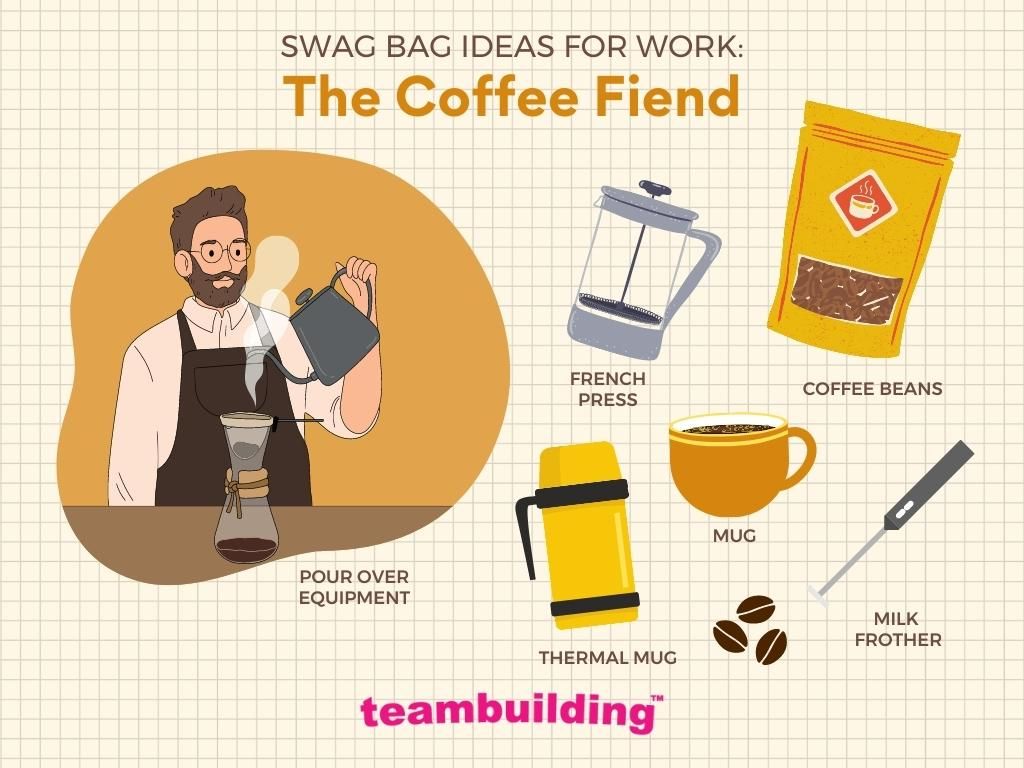 Items to include: Mug, mug warmer, thermal mug, French press/chemex/pour over equipment, bag of beans