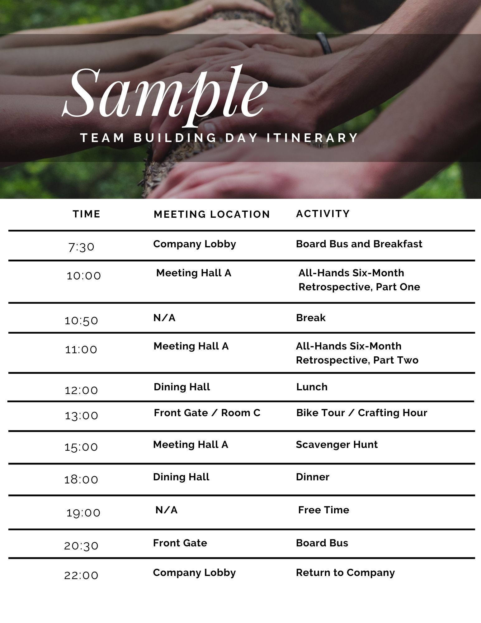 Examples of team building days include team meetings and company retreats. You can structure these events by creating team building programs.