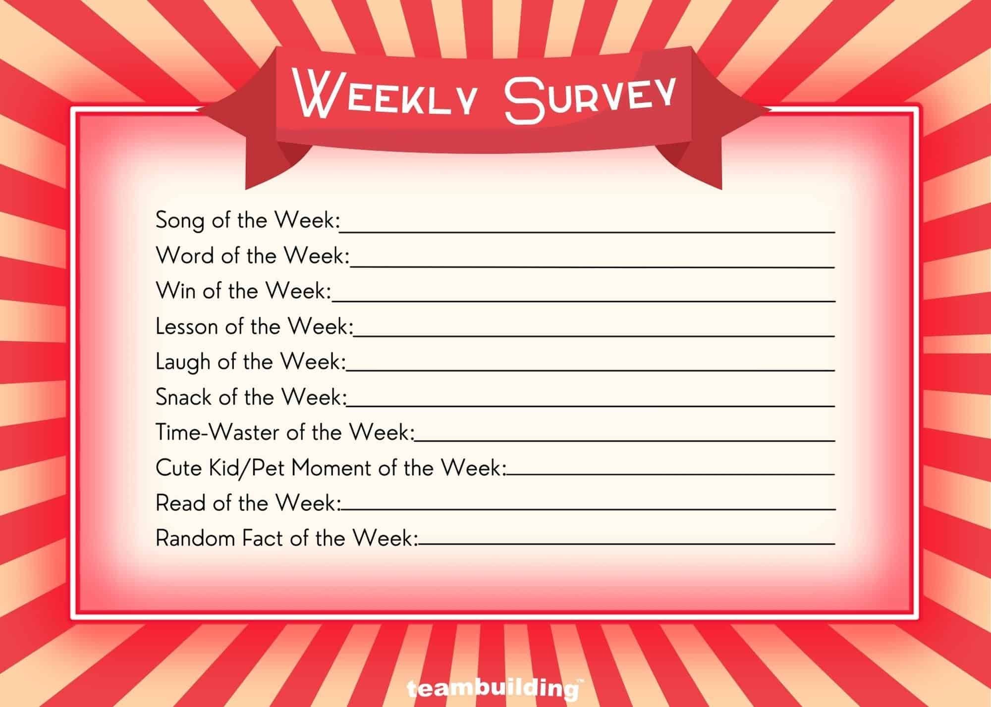 Weekly Surveys are a just-for-fun way to reflect on the week and share current moods and likes with the team. Folks often enjoy filling out personal surveys on social media, and may jump at the chance to share about themselves and learn more about coworkers.