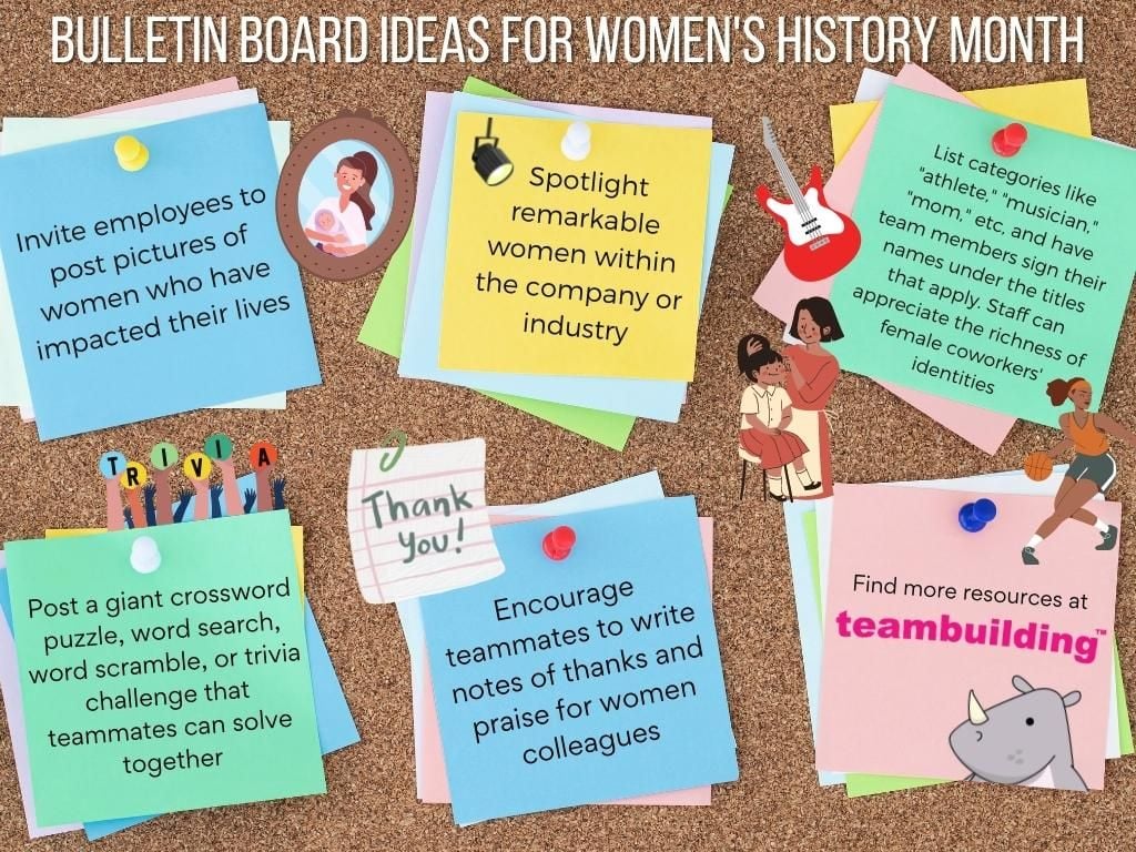 Office bulletin boards offer opportunities for low-touch Women’s History Month programs. You can use the boards to educate staff and encourage employees to interact. There are many creative ways to use this space for Women’s Month programming.